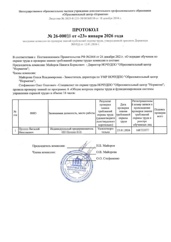 После обучения выдается протокол проверки знаний с внесением в ЕИСОТ Минтруда.