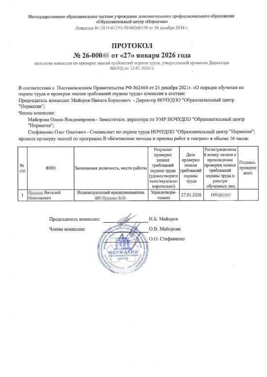 Полное наименование: Обучение по программе «Охрана труда В. Безопасные методы и приемы работ в театрах (ОТ.В.29)»