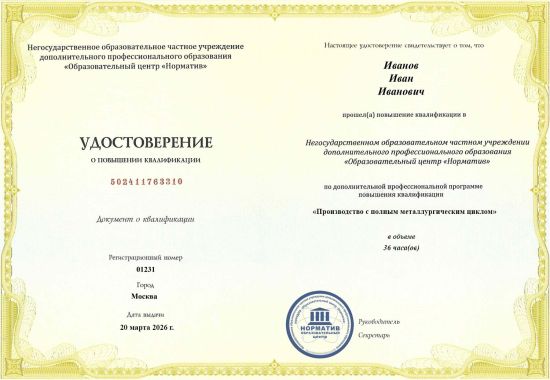 Полное наименование: Повышение квалификации по программе «Производство с полным металлургическим циклом (Б.3.8)»